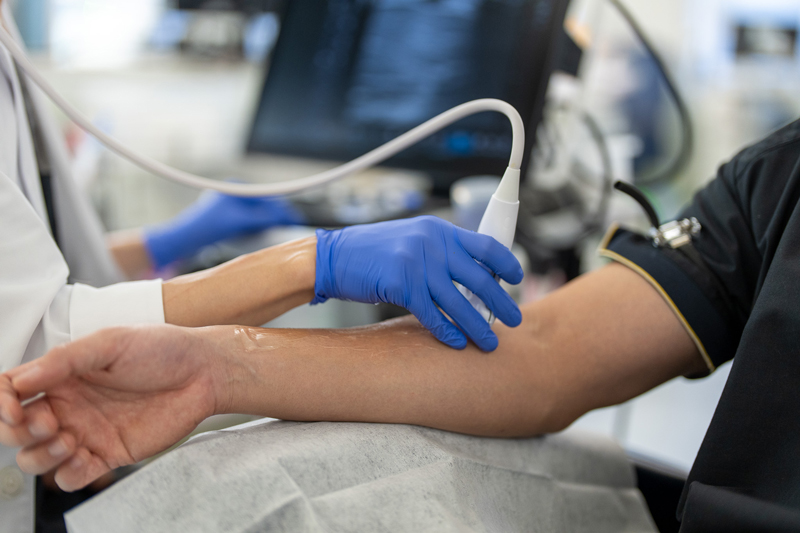穿刺が困難な患者さんについては、超音波検査装置を用いた穿刺を行い、確実かつ安全に穿刺ができる体制にしています。狭窄・閉塞などでシャント血管に異常が生じた場合は超音波検査装置ガイドのもとVAIVT治療を医師と共に実施、シャント血管が長期に使用できるようサポートしています。また、医師、看護師、臨床工学技士など院内スタッフに対して、バスキュラーアクセスの取り扱いや穿刺技術に関する教育・指導も実施しています。医療チーム全体でスキルの均質化を図り、安全性と質の高い医療体制の維持に努めています。