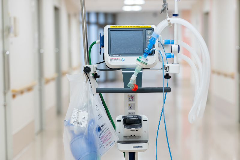 当科では、維持透析患者さんを対象に、急性期の呼吸状態悪化や心不全増悪時に対応できるよう、人工呼吸器を3台保有し、安全かつ迅速な呼吸管理を行っています。 臨床工学技士が中心となり、機器の整備、作動確認、定期点検を徹底し、医師・看護師と連携して適切な設定調整やモニタリングを実施しています。また、透析治療との併行管理にも対応し、患者さんの全身状態を踏まえた総合的なサポートを提供できる体制を整えています。