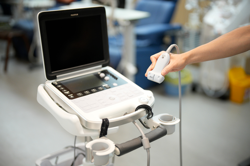 臨床工学科では透析患者さんを中心に医師・看護師との連携の下、透析患者さんのQOL・ADL向上に努めております。 血液浄化業務では透析準備から穿刺、開始、終了までのルーチン業務に加え、患者様の状態に応じた透析条件の設定、 バスキュラーアクセス(VA)管理、アフェレーシス療法、透析液の水質管理などを行っています。 特に、VA管理に関しては定期的に超音波エコーを用いて検査を行い、VAトラブルの回避を図るとともに、 緊急時における対応やエコーガイド下PTAの補助も行っています。 最近ではiPadを用いてVA管理システムを構築することで、患者様の情報の共有やベッドサイドでの即時トラブル対応など、 より高質な管理体制を目指しています。