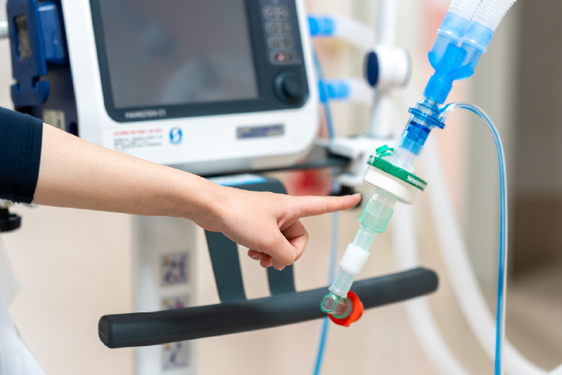 当科では、維持透析患者さんを対象に、急性期の呼吸状態悪化や心不全増悪時に対応できるよう、人工呼吸器を3台保有し、安全かつ迅速な呼吸管理を行っています。 臨床工学技士が中心となり、機器の整備、作動確認、定期点検を徹底し、医師・看護師と連携して適切な設定調整やモニタリングを実施しています。また、透析治療との併行管理にも対応し、患者さんの全身状態を踏まえた総合的なサポートを提供できる体制を整えています。