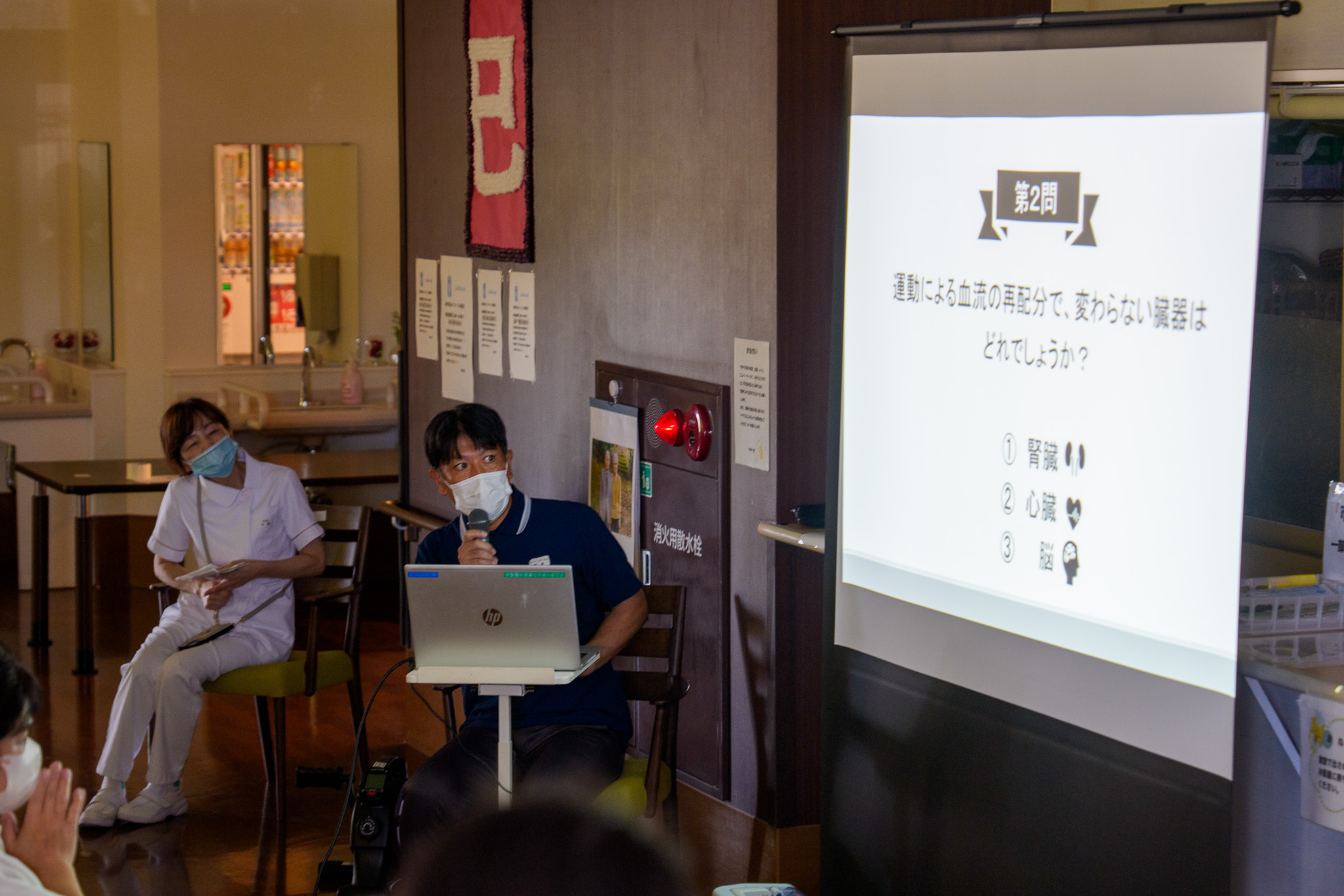 体験型プログラムでは、エルゴメータを用いたペダル運動を実施しました。今回は特別に、鞍馬山を散歩する映像をスクリーンに映し出し、まるで山道を歩いているかのように楽しみながら運動できる工夫を取り入れました。参加者の皆さんからは「運動しながら旅行気分が味わえる」「家にも欲しい。価格はいくら?」といった声が上がり、運動がより身近で前向きなものとして受け止められていました。
